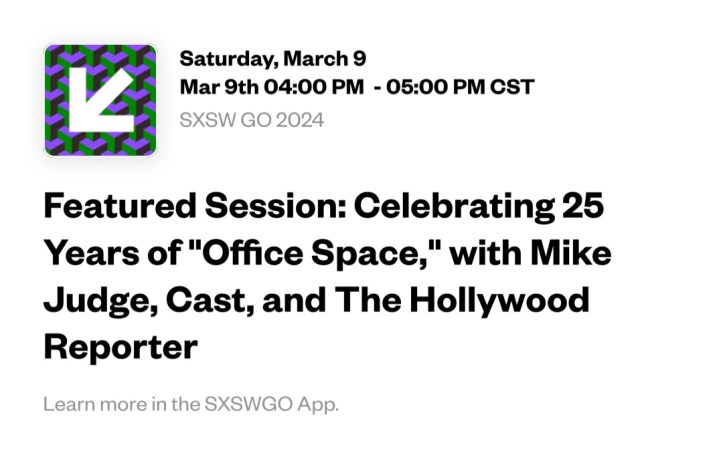 I’m seeing Featured Session: Celebrating 25 Years of “Office Space,” with Mike Judge, Cast, and The Hollywood Reporter at SXSW GO 2024. See this session at https://schedule.sxsw.com/2024/events/PP1145798