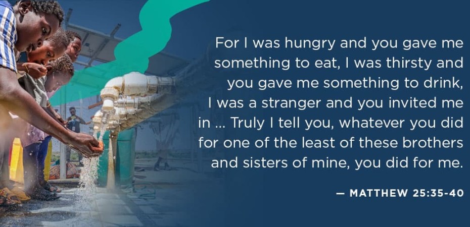 For I was hungry and you gave me something to eat, I was thirsty and you gave me something to drink, I was a stranger and you invited me in … Then the righteous will answer him, “Lord, when did we see you hungry and feed you, or thirsty and give you something to drink? When did we see you a stranger and invite you in, or needing clothes and clothe you?” … The King will reply, “Truly I tell you, whatever you did for one of the least of these brothers and sisters of mine, you did for me.” — Matthew 25:35-40